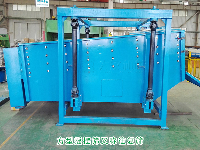 方型搖擺篩又稱往復(fù)篩,其驅(qū)動(dòng)裝置所產(chǎn)生的振動(dòng)力是一繞定軸、方向呈一定規(guī)律變化的慣性力,其本質(zhì)是由偏心輪繞定軸轉(zhuǎn)動(dòng)所形成的往復(fù)慣性力。篩機(jī)啟動(dòng)后,篩機(jī)搖動(dòng)體即篩箱在慣性力的作用下作前后往復(fù)運(yùn)動(dòng),篩箱帶動(dòng)篩面作周期性搖動(dòng),從而使篩面上的物料隨篩箱一同作定向跳躍式運(yùn)動(dòng),期間,小于篩面孔徑的物理通過(guò)篩孔落到下層,成為篩下物,大于篩面孔徑的物料經(jīng)連續(xù)翻滾跳躍運(yùn)動(dòng)后從排料口排出,完成篩分工作。